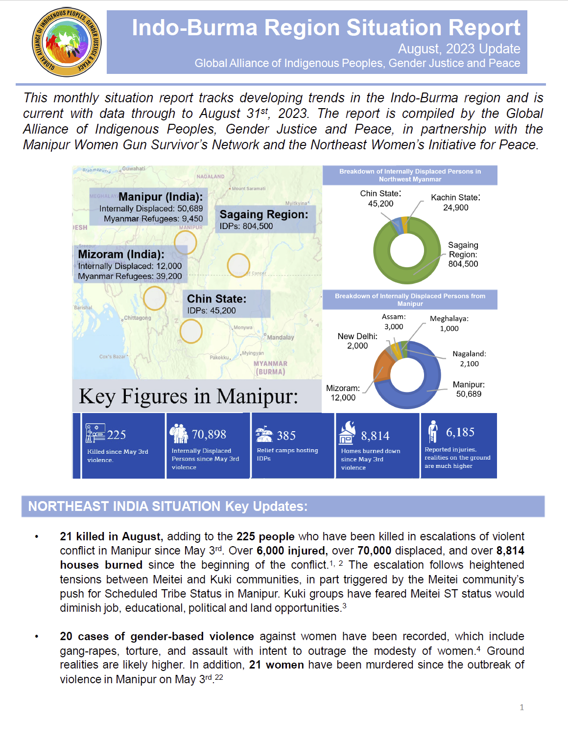 1. Global Alliance of Indigenous Peoples, Gender Justice and Peace "Internal Tracking of Manipur Violence" Unpublished Data, 2023.